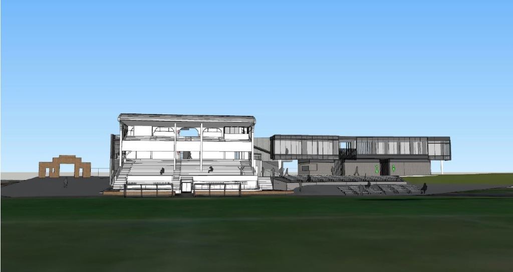 The plans show how the existing 1970s brick commentator’s box would be demolished and replaced with a new building, which would be connected to the rear of the grandstand.