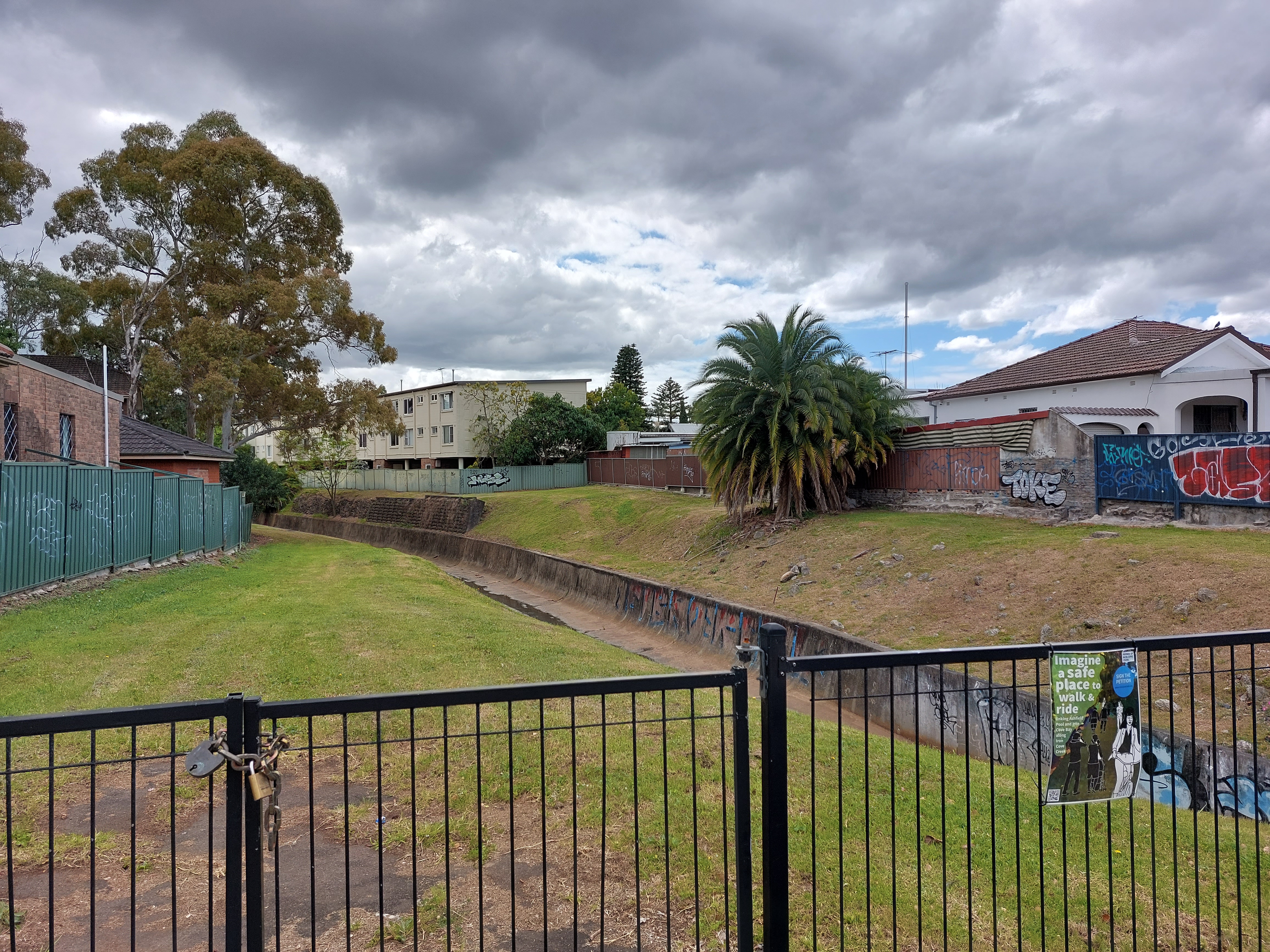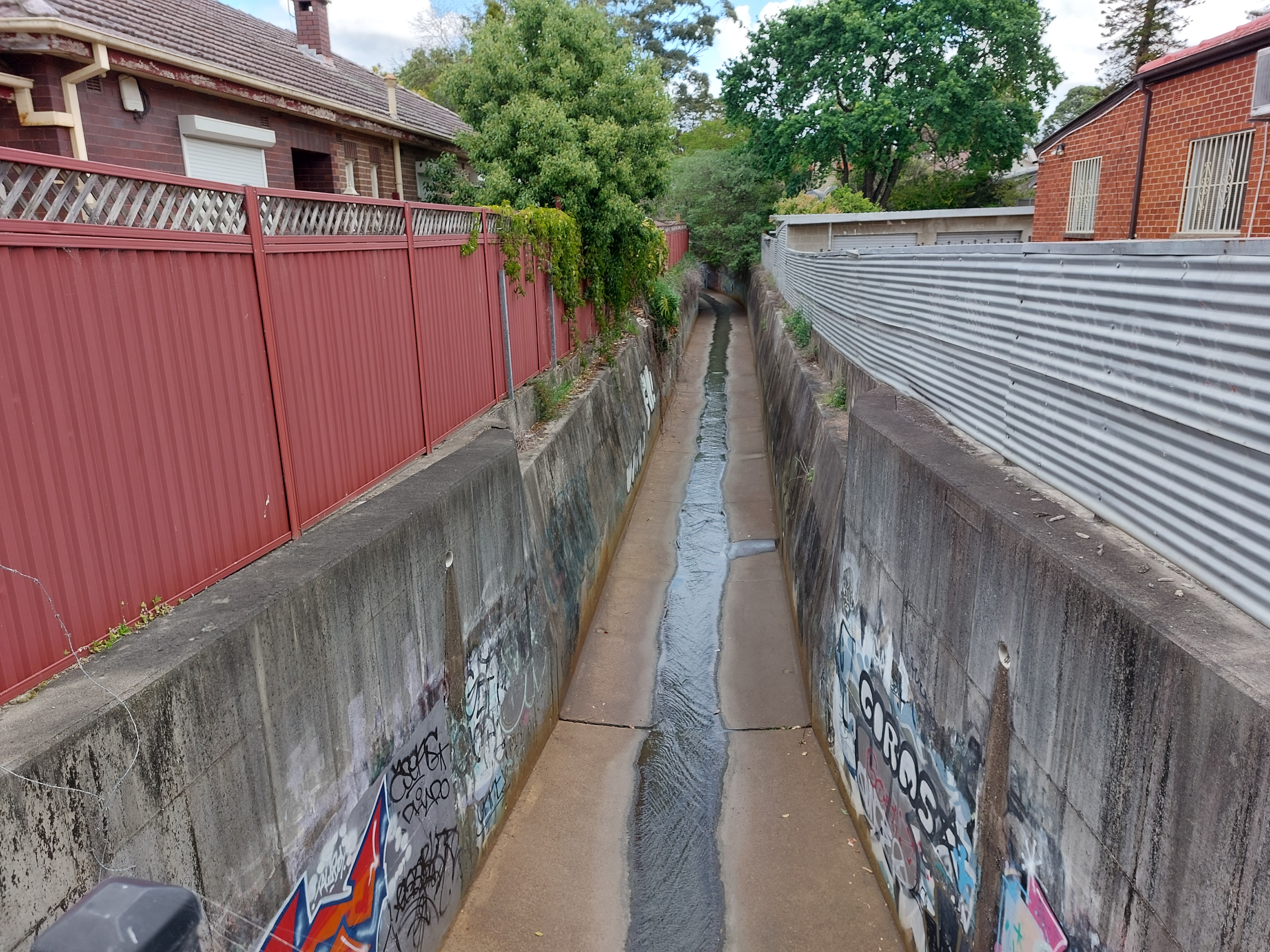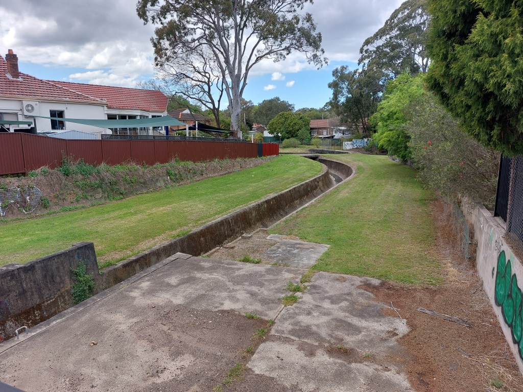 At its far southern reach, Iron Cove Creek (also known as the Dobroyd Canal) first forms as a narrow stormwater drain threading its way between homes, under the main Western railway line and next to Ashfield pool.