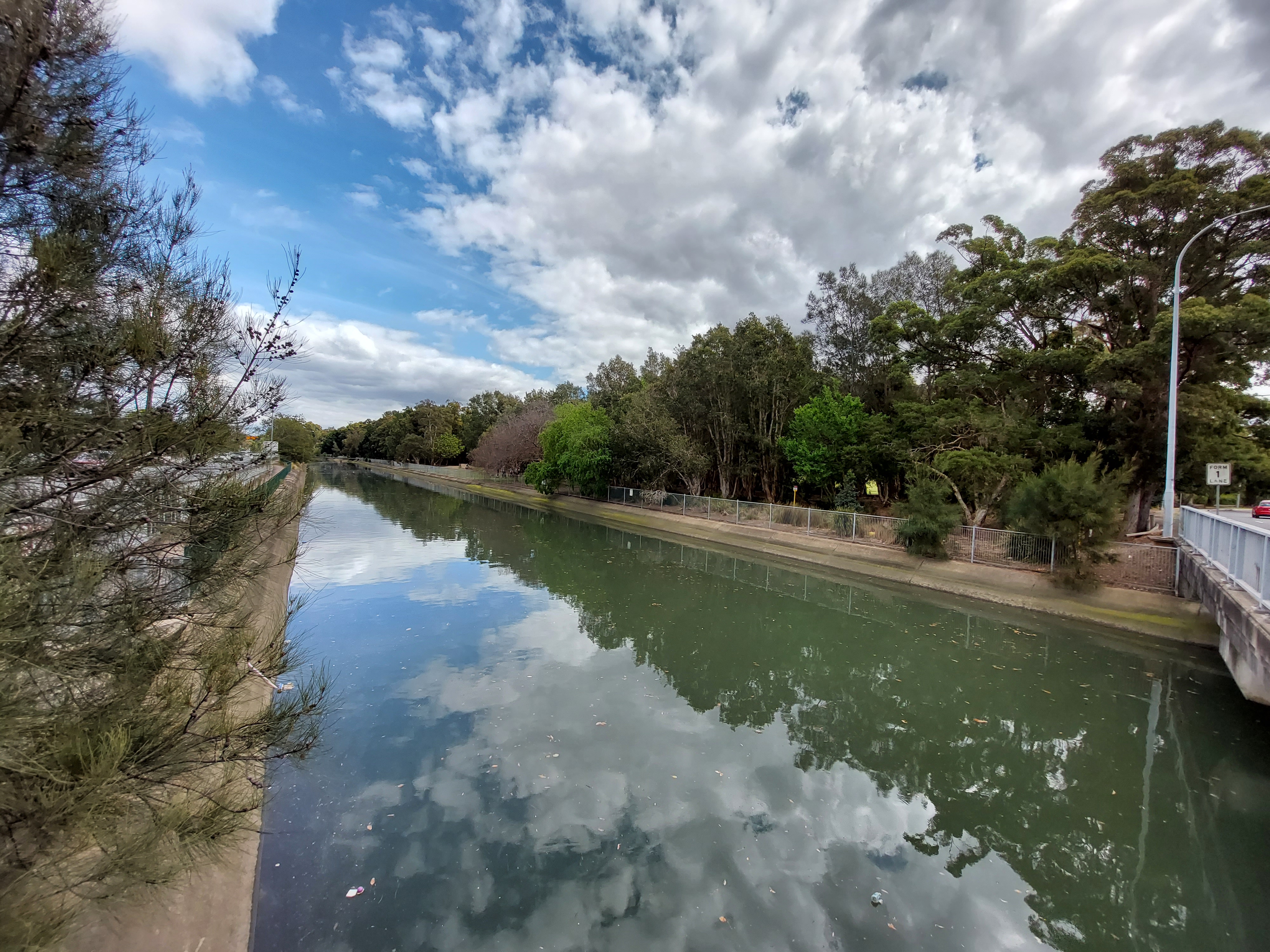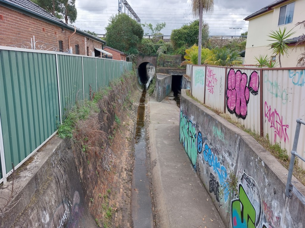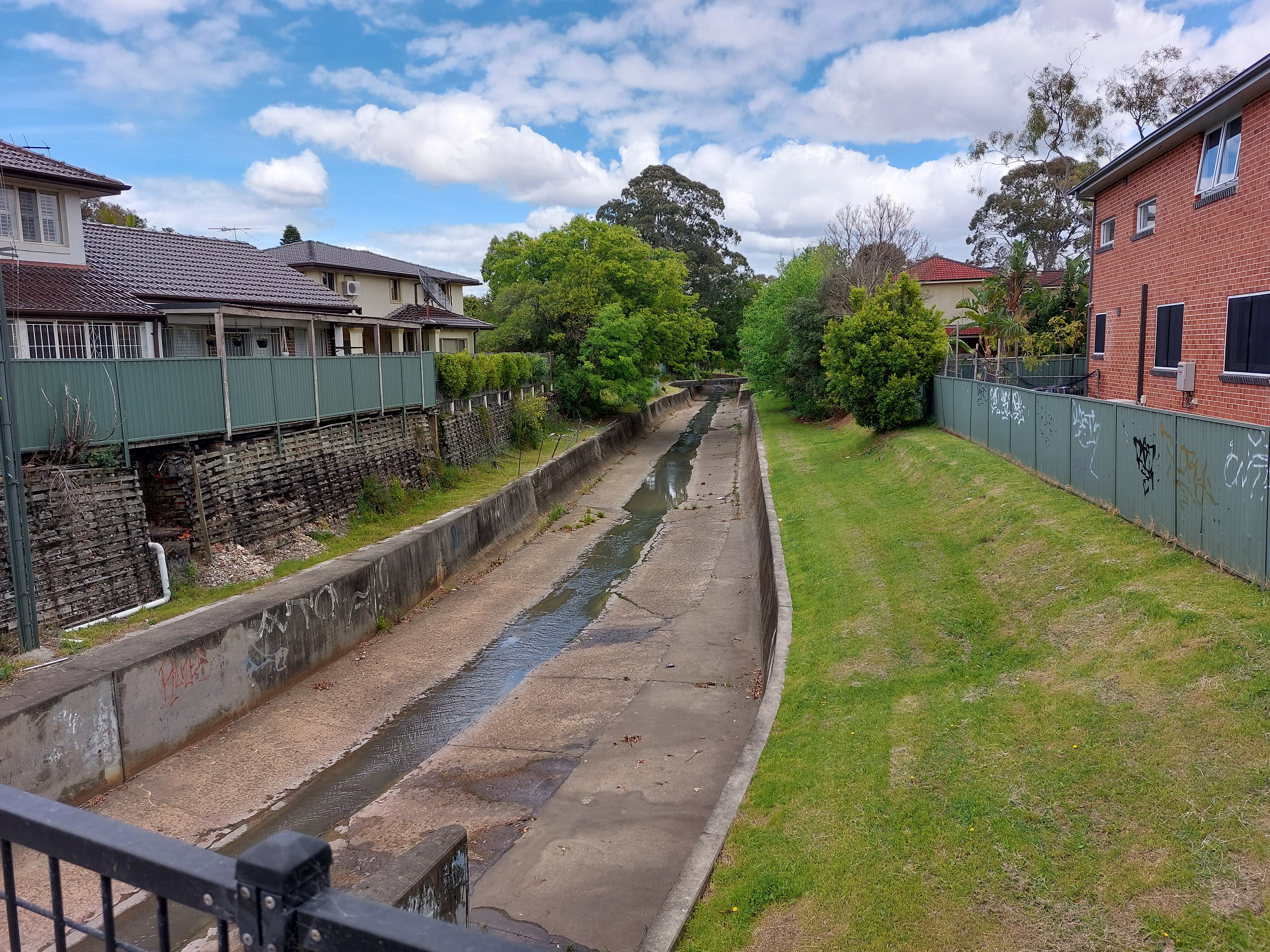 At its far southern reach, Iron Cove Creek (also known as the Dobroyd Canal) first forms as a narrow stormwater drain threading its way between homes, under the main Western railway line and next to Ashfield pool.