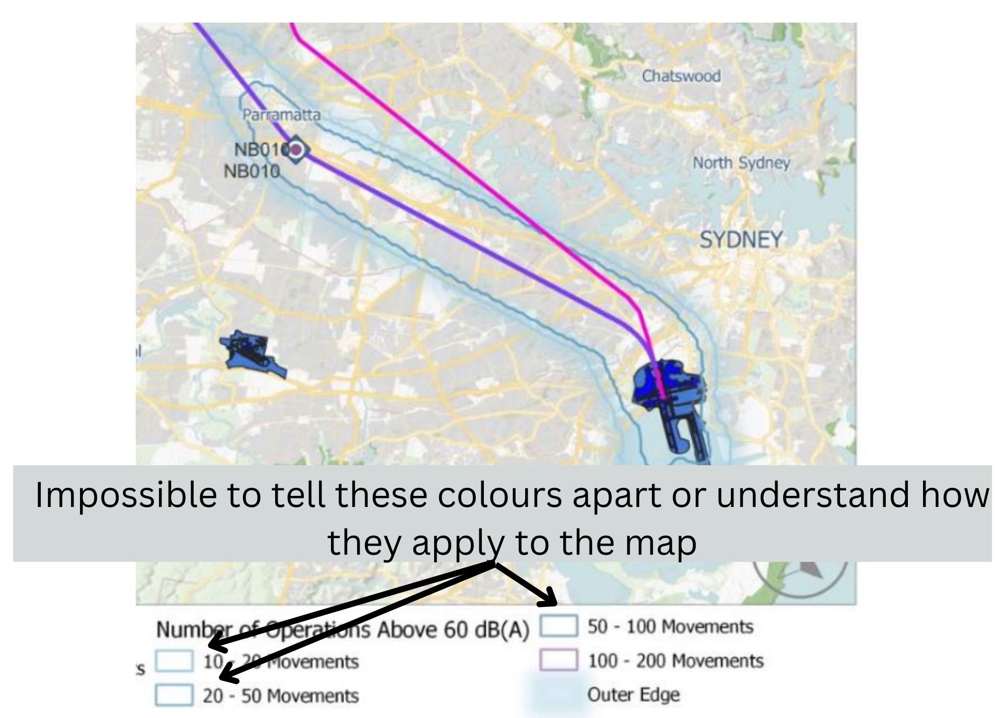 The only map which shows noise impacts has key colours which are impossible to separate and which can’t be applied to the map (see below).