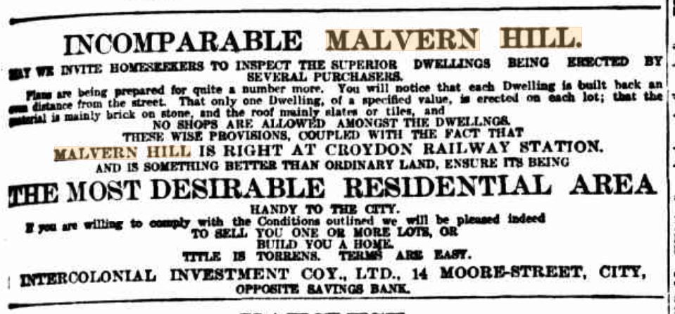 Ashfield and Burwood Council worked together to use these powers to create a model suburb for the new subdivided area south of Croydon station, which was marketed by the name Malvern Hill. The suburb was based on the emerging belief that homes should be well-built, surrounded by fresh air and light and well-separated from industry.