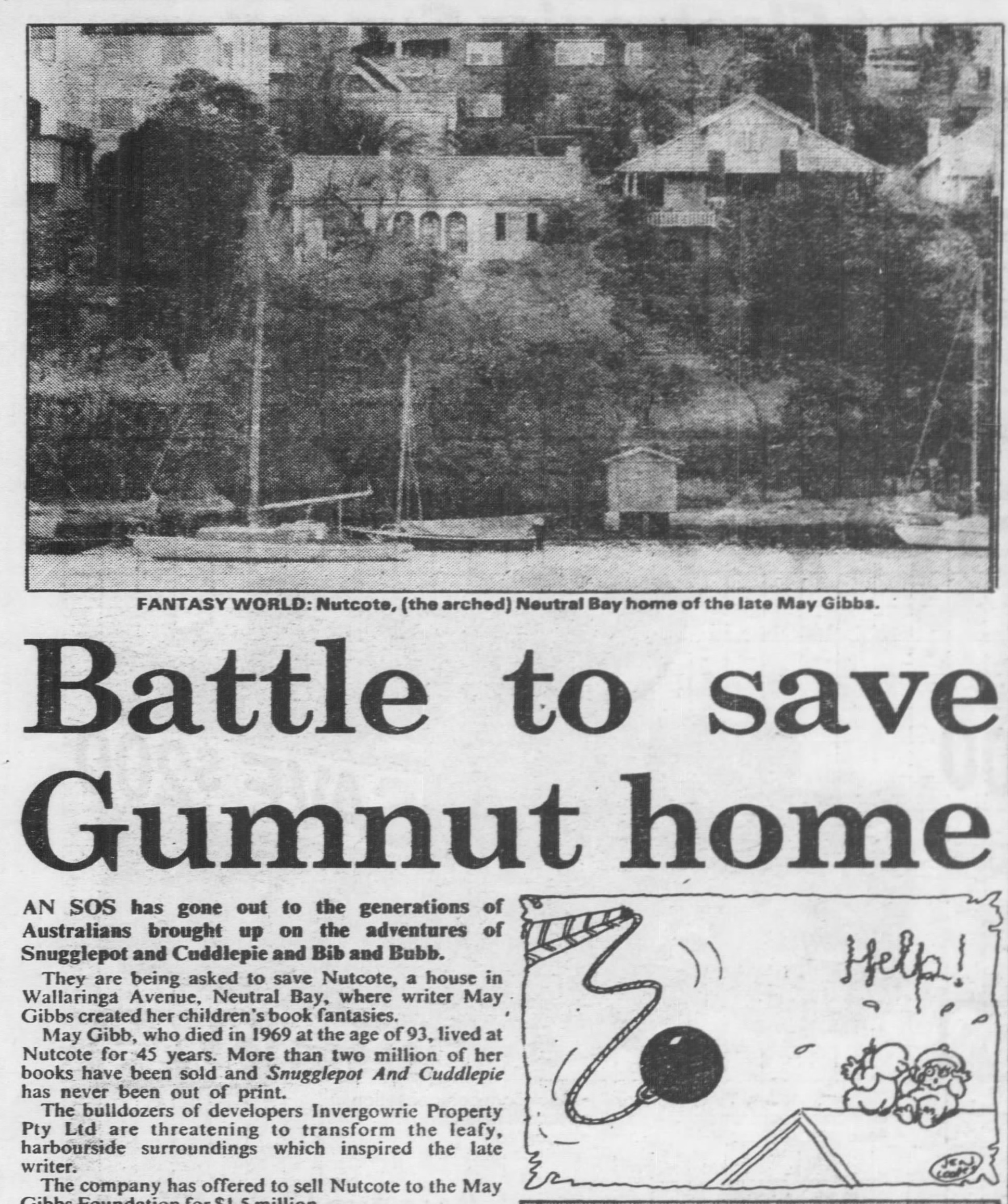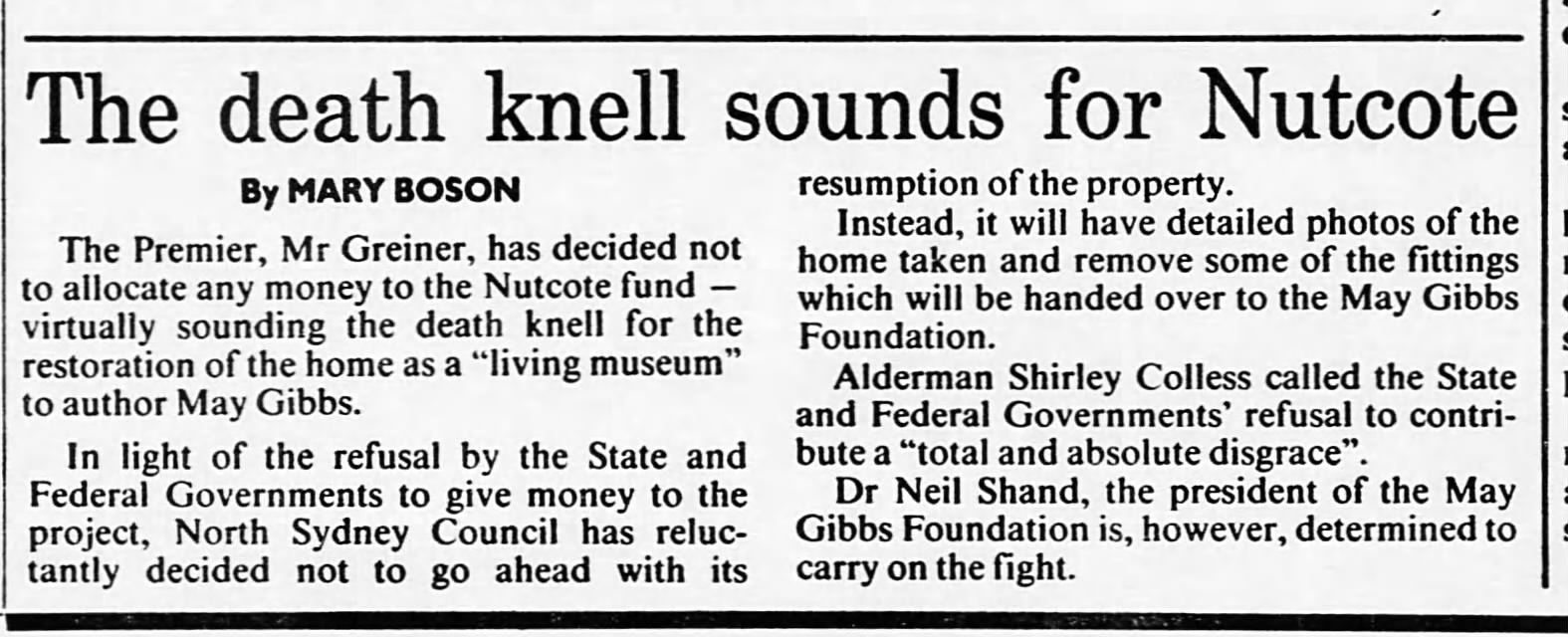 In January 1988, this campaign received a boost when North Sydney Council voted to resume the site, but on the condition that the NSW and Australian Governments each contribute one third of the cost, with the council and newly-formed May Gibbs Foundation the other third.