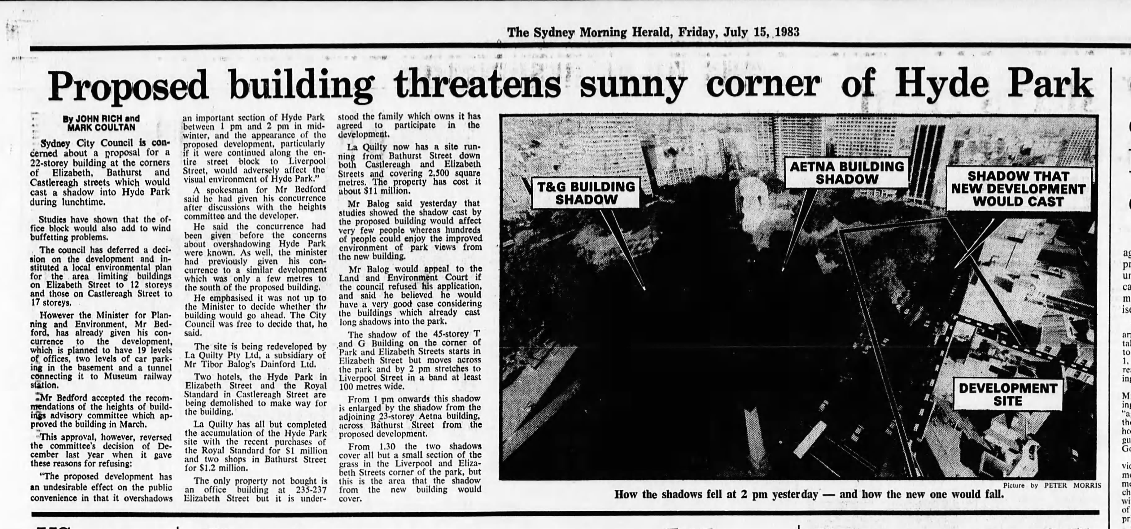In July 1983, the Sydney Morning Herald broke the story that a 22-storey (75m high) building, by developer La Quilty Pty Ltd, had been approved on Elizabeth St despite the fact it would cast a new shadow into southern Hyde Park.