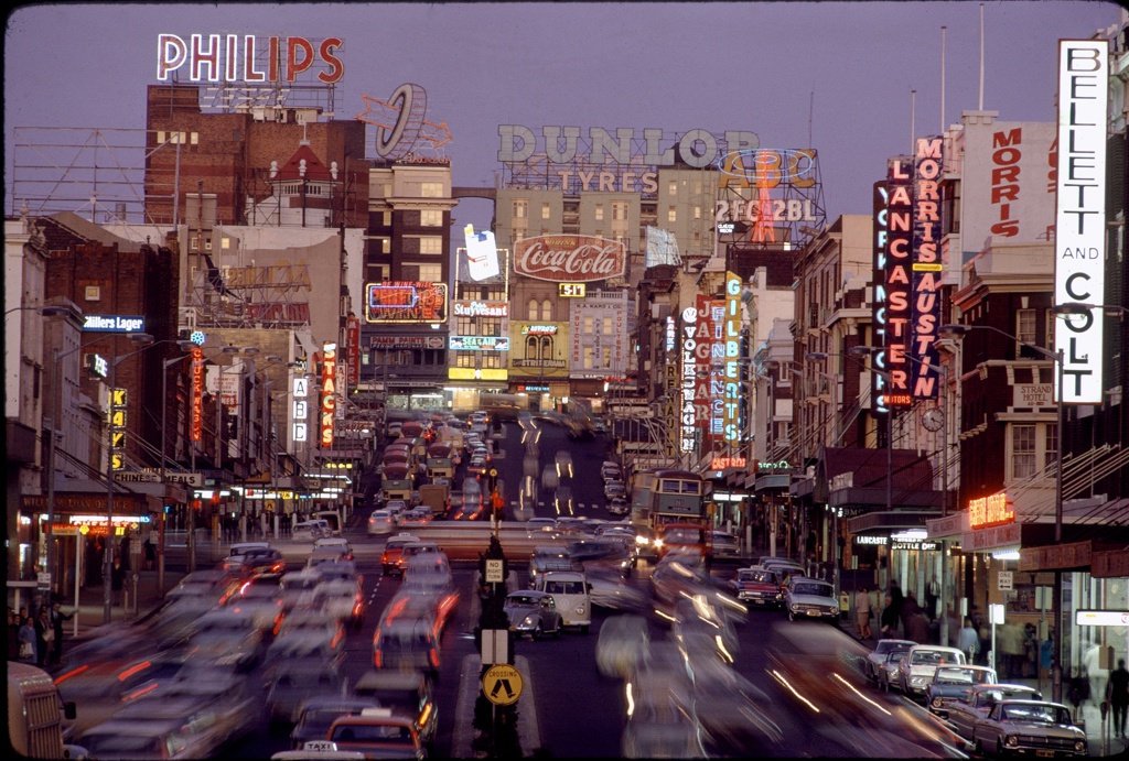 Slessor was writing about the kaleidoscope of colours on William St – the neon advertising signs, slow-moving red tail-lights of cars and the green traffic lights. Everyone else thought they were gaudy. Slessor loved them.
