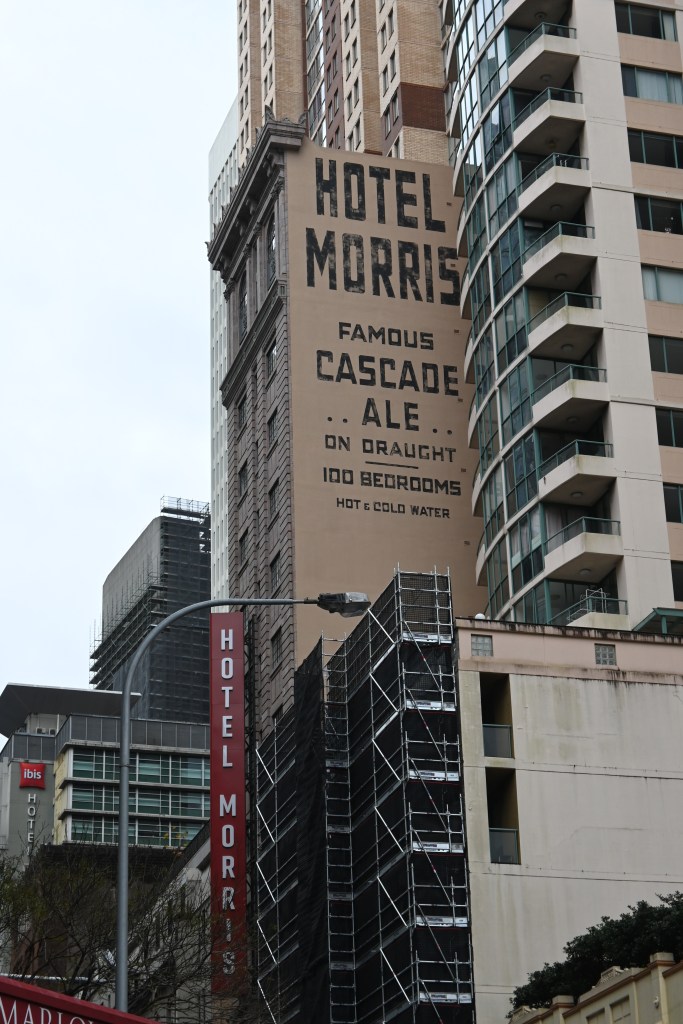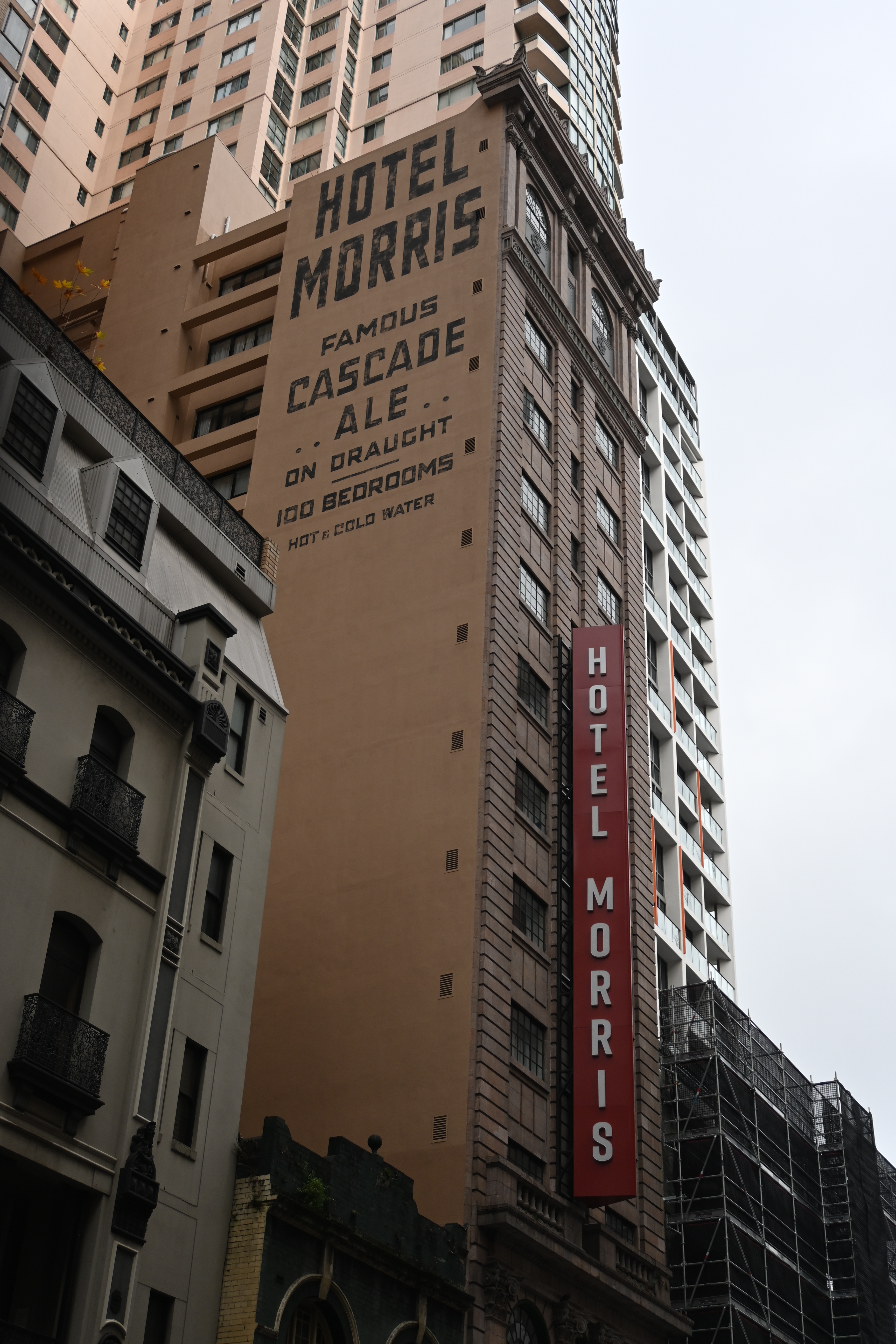 For the first twenty years of its life, the Hotel also featured signs on its north and south side walls, with the words “Hotel Morris, Famous Cascade Ale on draught, 100 bedrooms, Hot and Cold Water”.