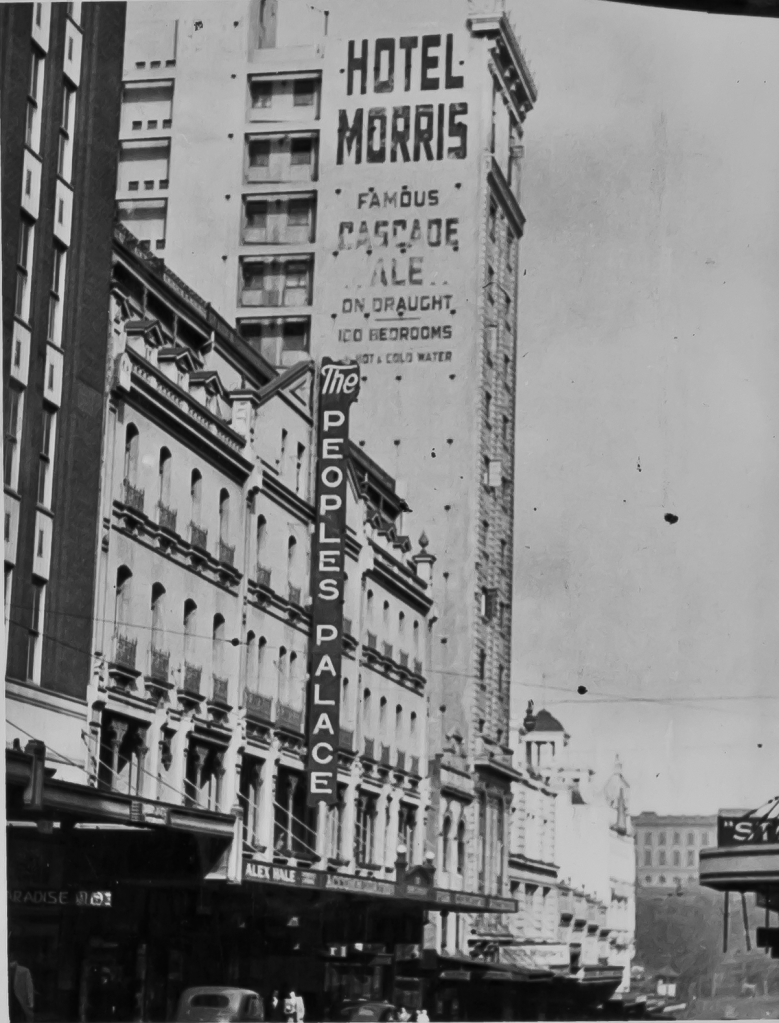 The Hotel Morris was built in the early 1930s on a narrow site at 412 Pitt St. It was 14 storeys high and contained 100 hotel rooms, and for 34 years was Australia’s tallest hotel.